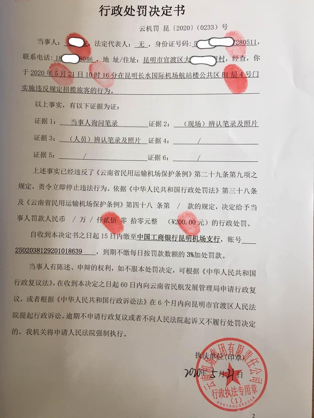 行政处罚决定书 云机罚 昆{2020} (0233)号