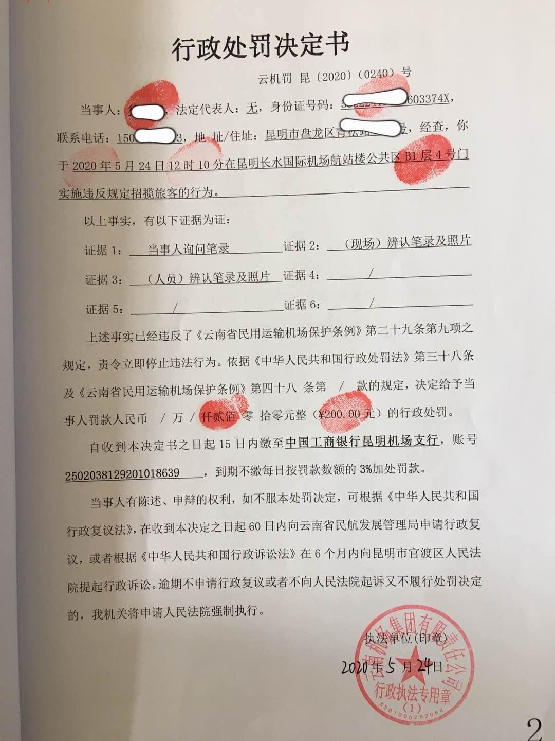 行政处罚决定书 云机罚 昆{2020} (0240)号