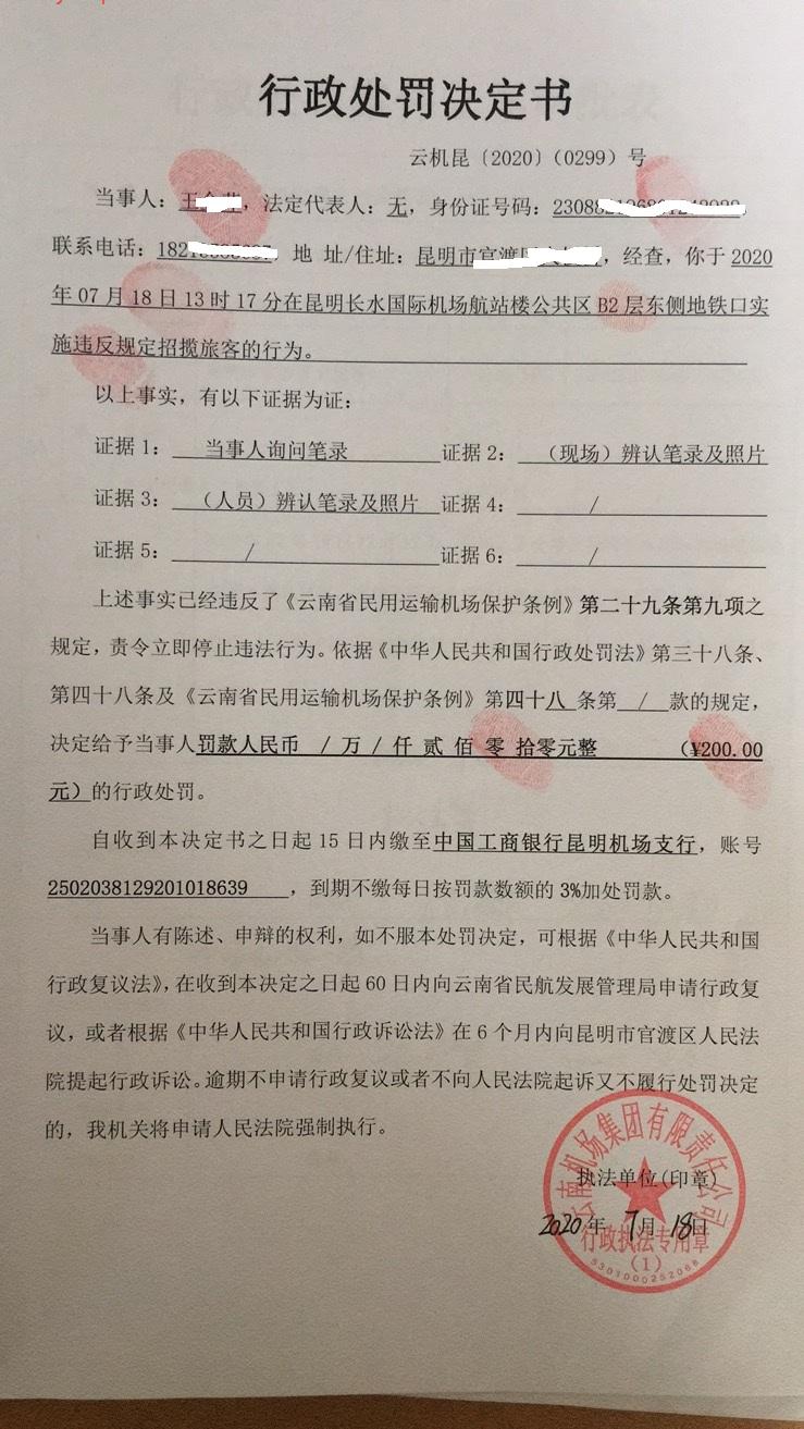 行政处罚决定书 云机罚 昆{2020} (0298)号