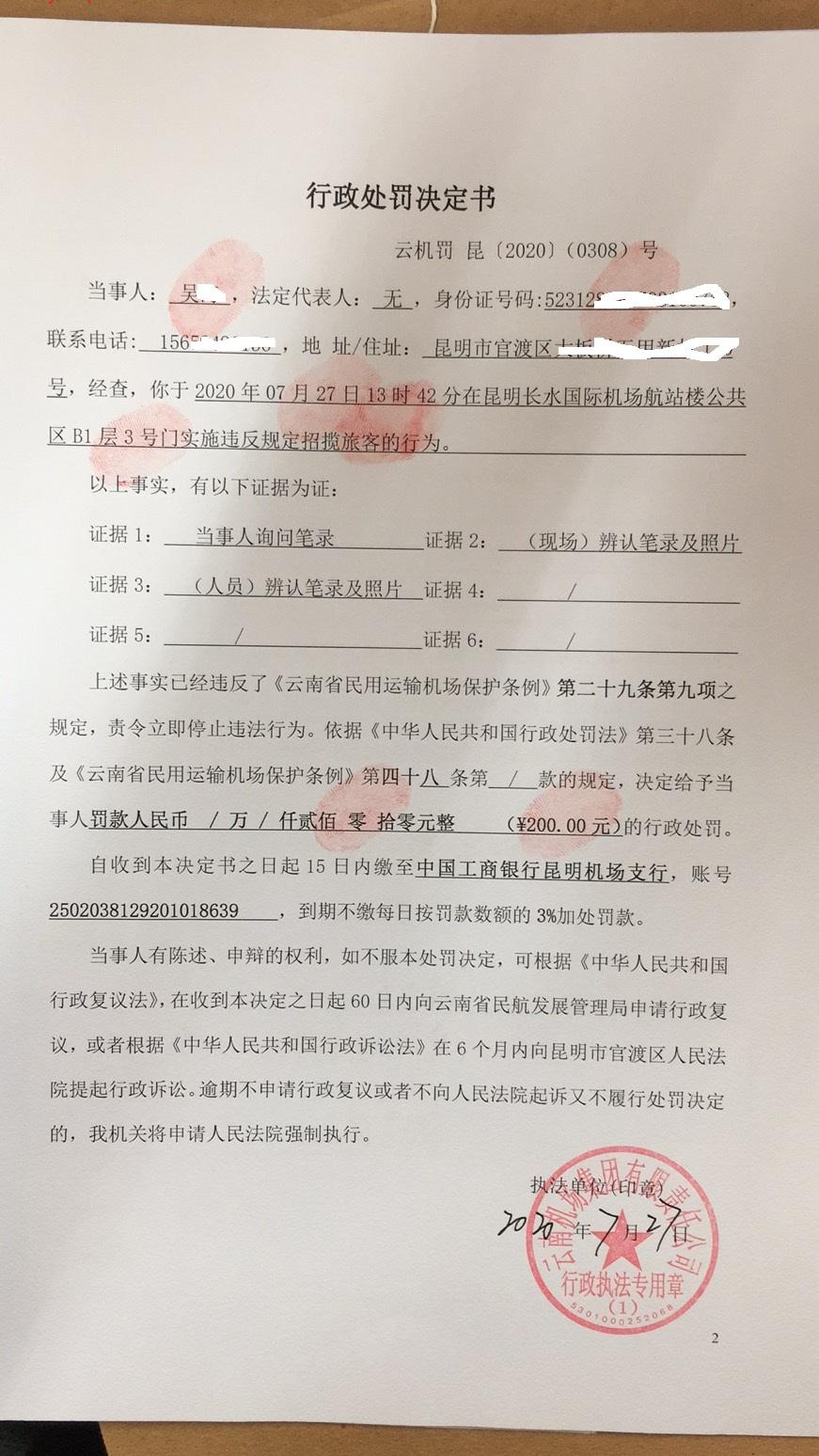 行政处罚决定书 云机罚 昆{2020} (0307)号