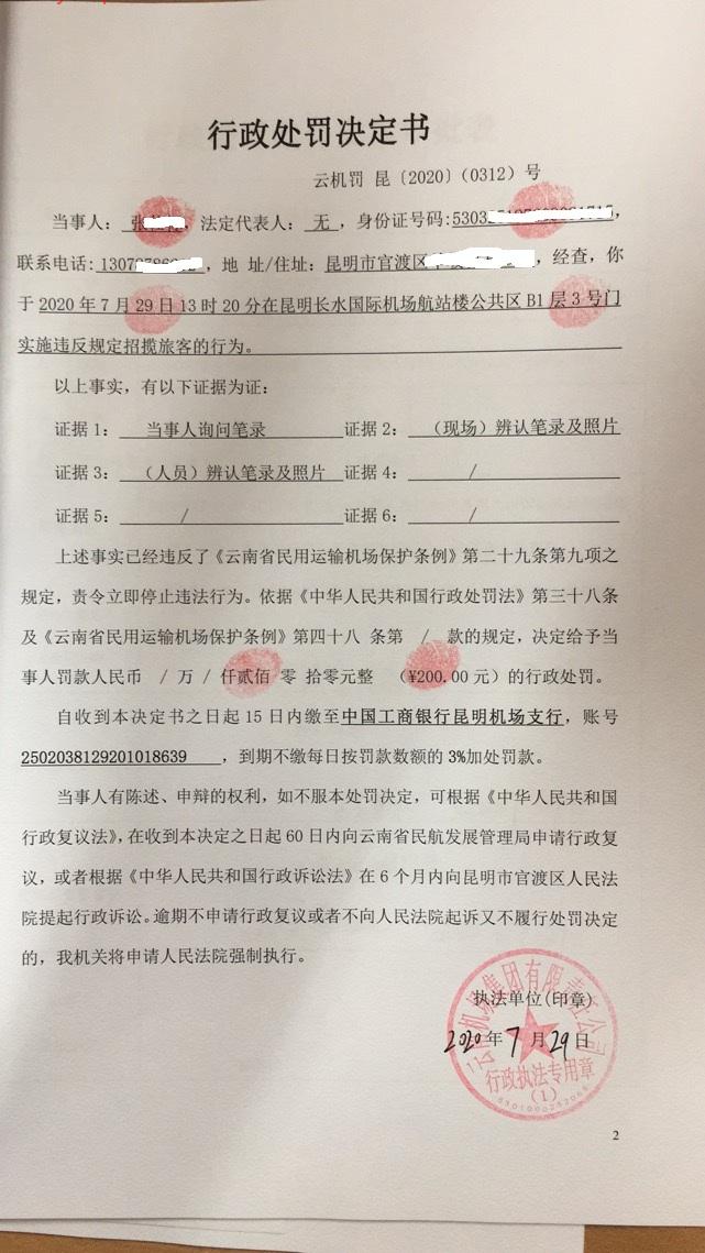 行政处罚决定书 云机罚 昆{2020} (0312)号