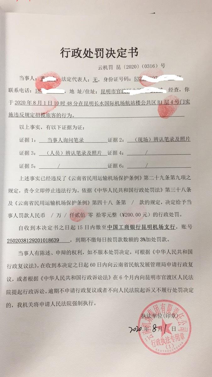 行政处罚决定书 云机罚 昆{2020} (0316)号