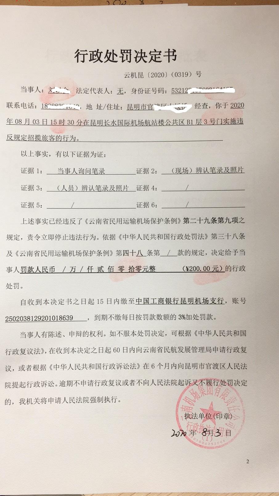 行政处罚决定书 云机罚 昆{2020} (0318)号