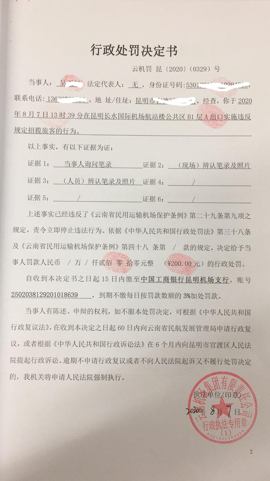 行政处罚决定书 云机罚 昆{2020} (0329)号
