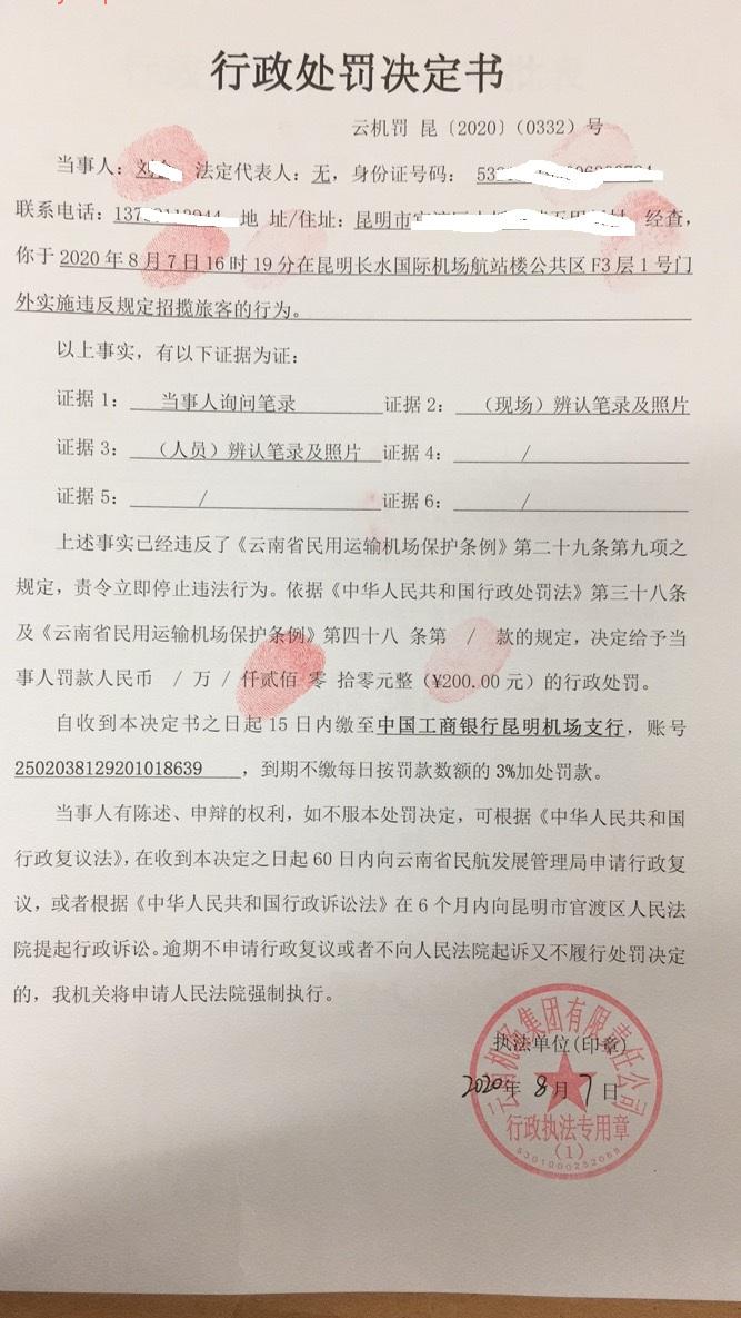 行政处罚决定书 云机罚 昆{2020} (0331)号