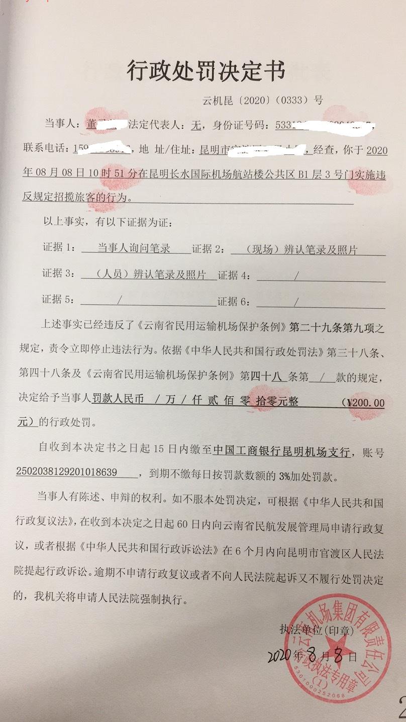 行政处罚决定书 云机罚 昆{2020} (0333)号