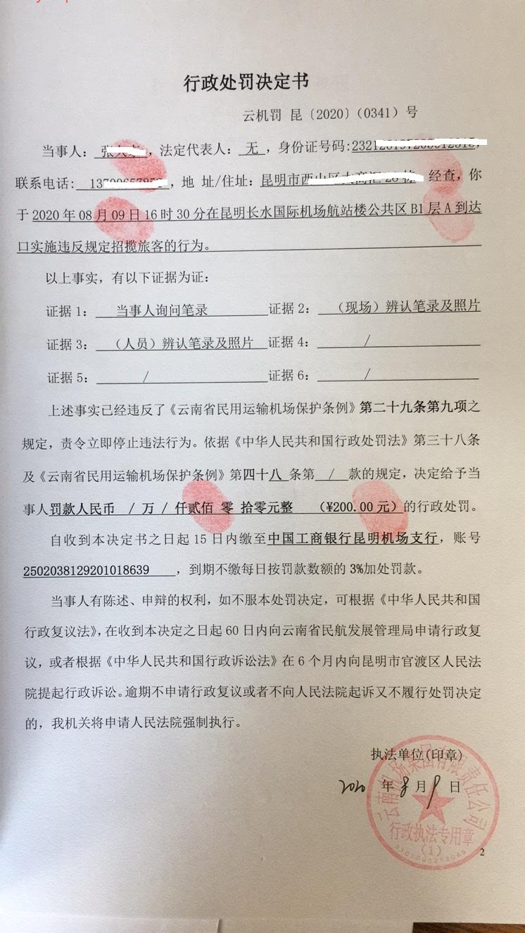 行政处罚决定书 云机罚 昆{2020} (0341)号
