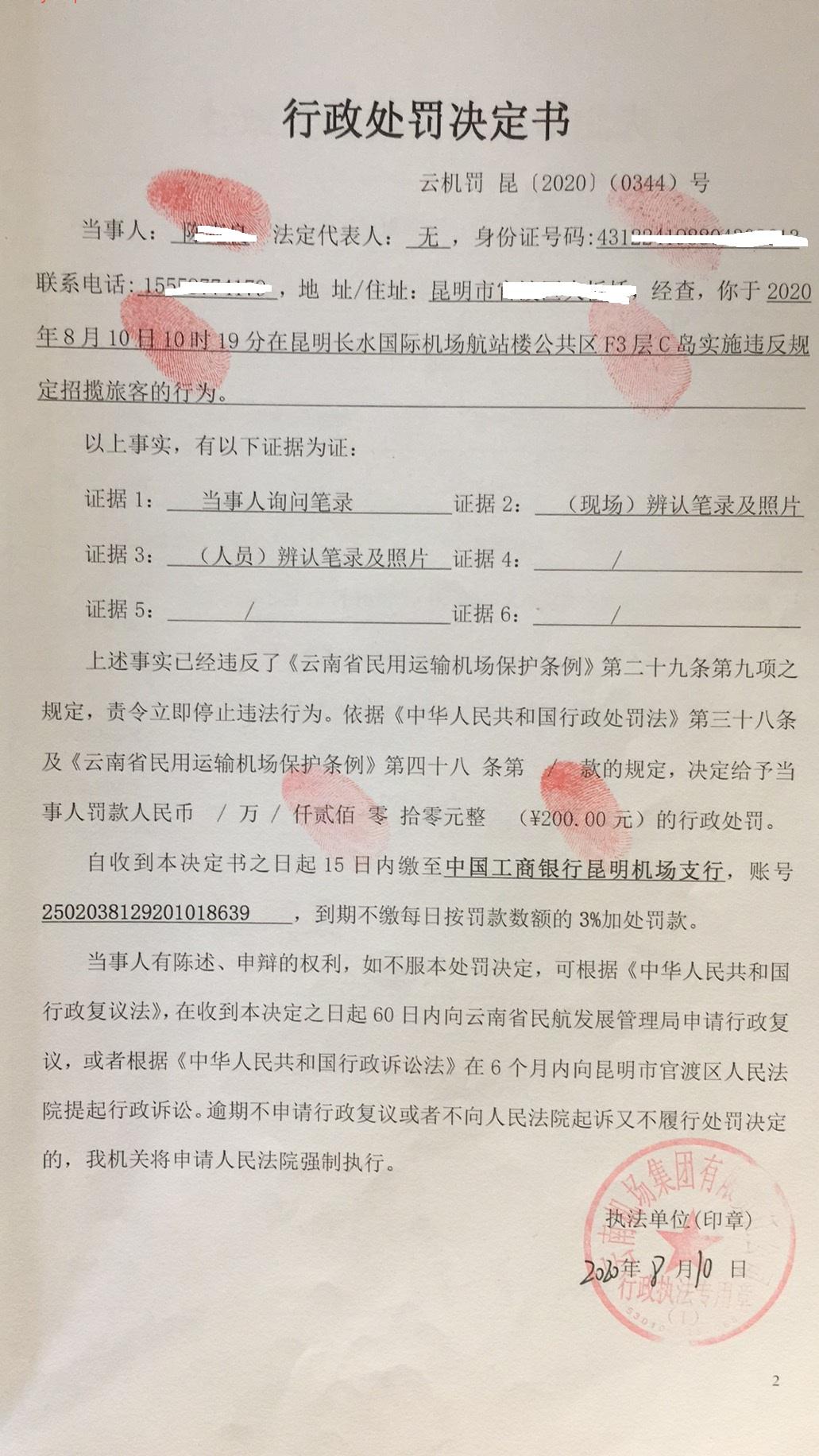 行政处罚决定书 云机罚 昆{2020} (0344)号