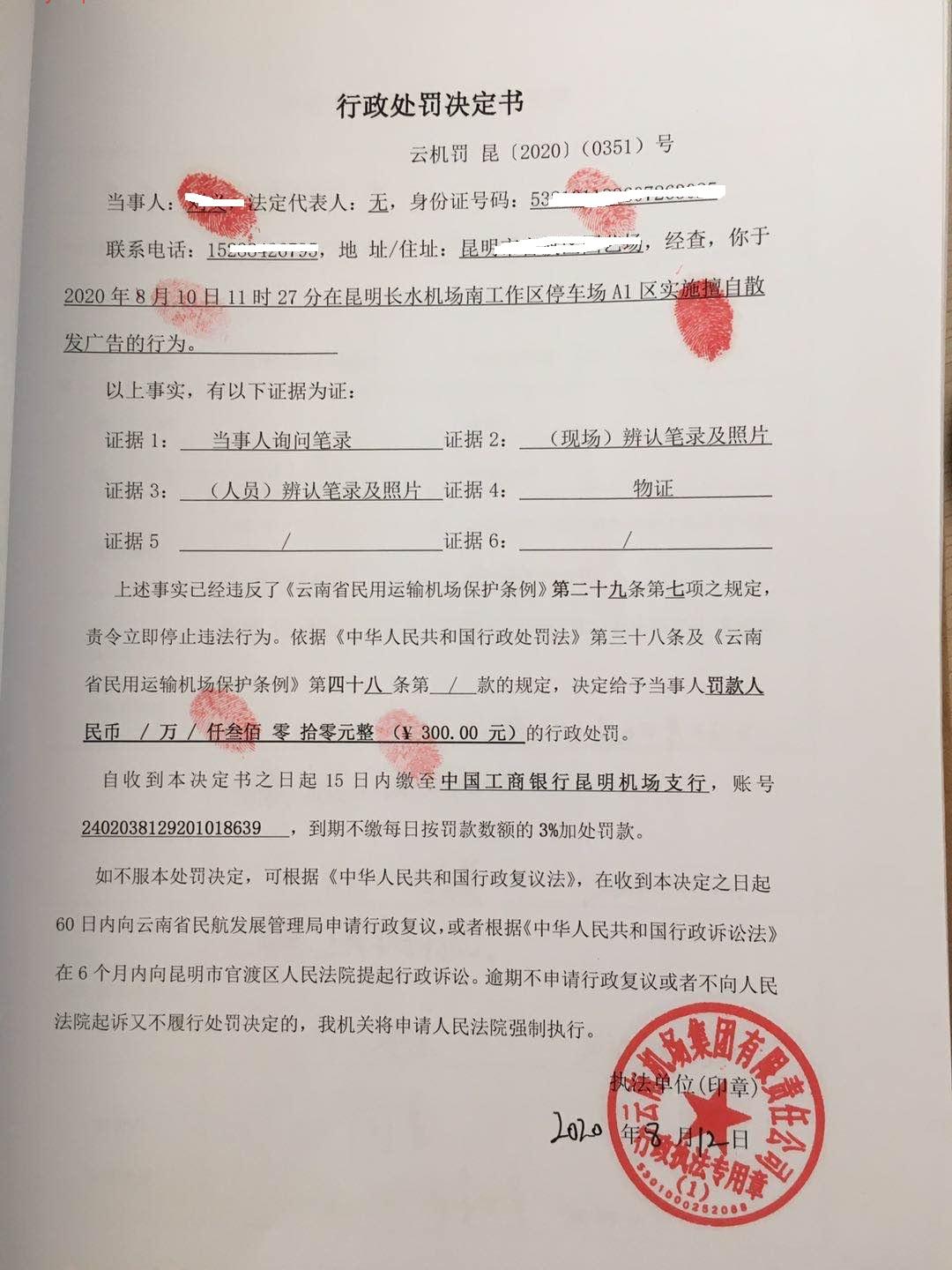 行政处罚决定书 云机罚 昆{2020} (0350)号