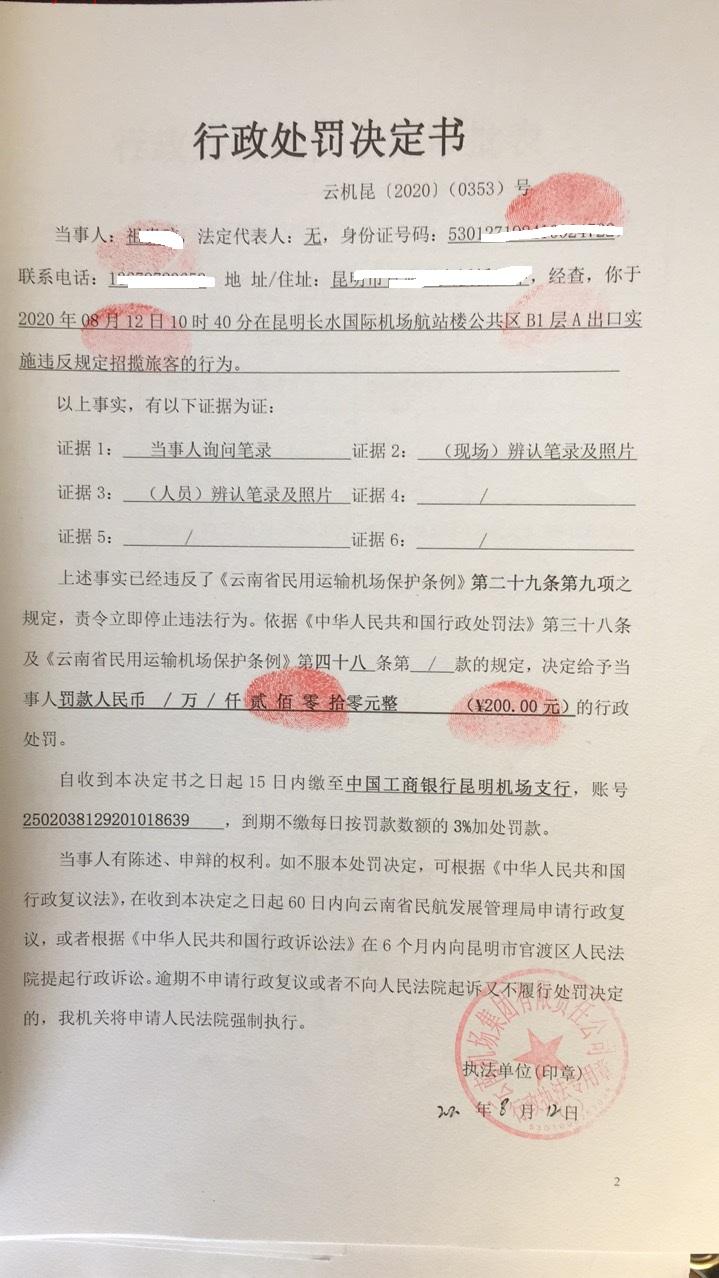 行政处罚决定书 云机罚 昆{2020} (0353)号
