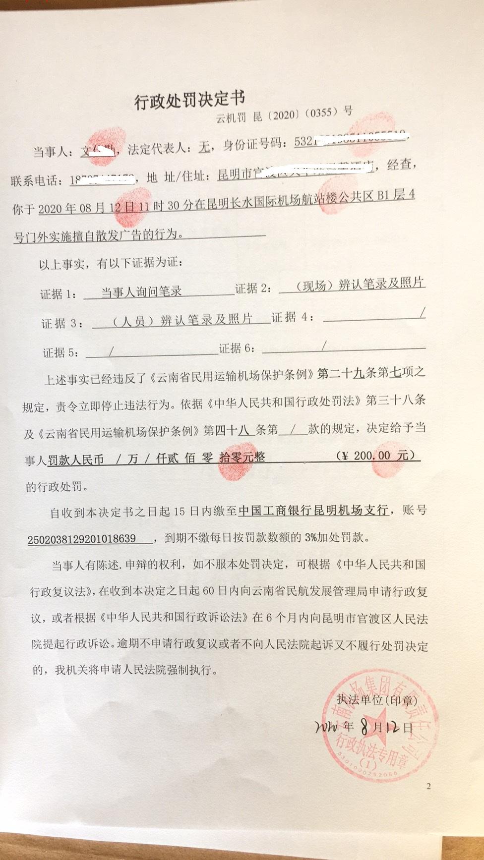 行政处罚决定书 云机罚 昆{2020} (0355)号