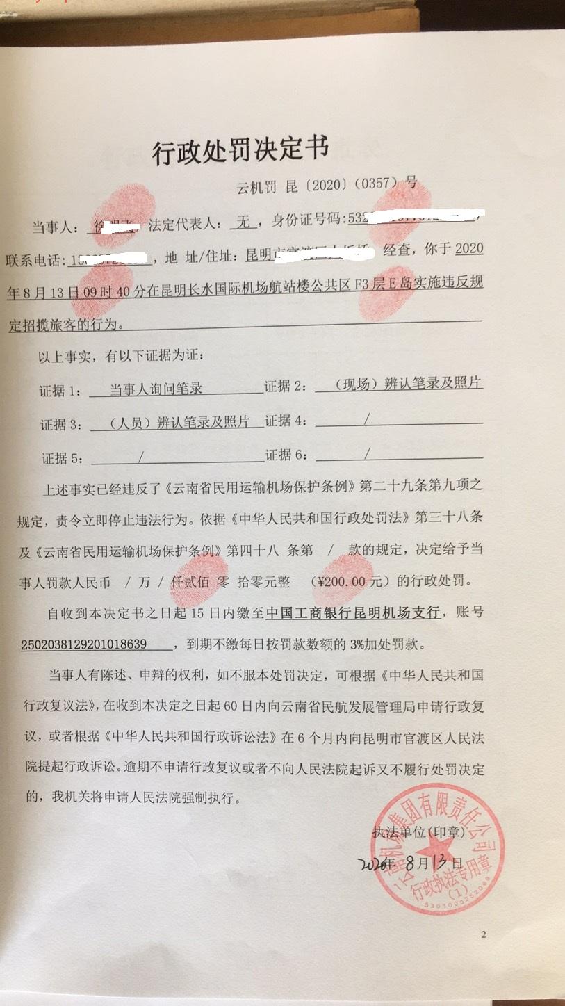 行政处罚决定书 云机罚 昆{2020} (0356)号