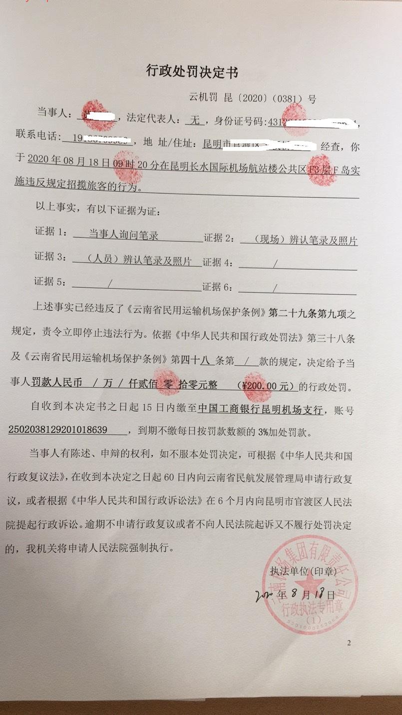 行政处罚决定书 云机罚 昆{2020} (0381)号