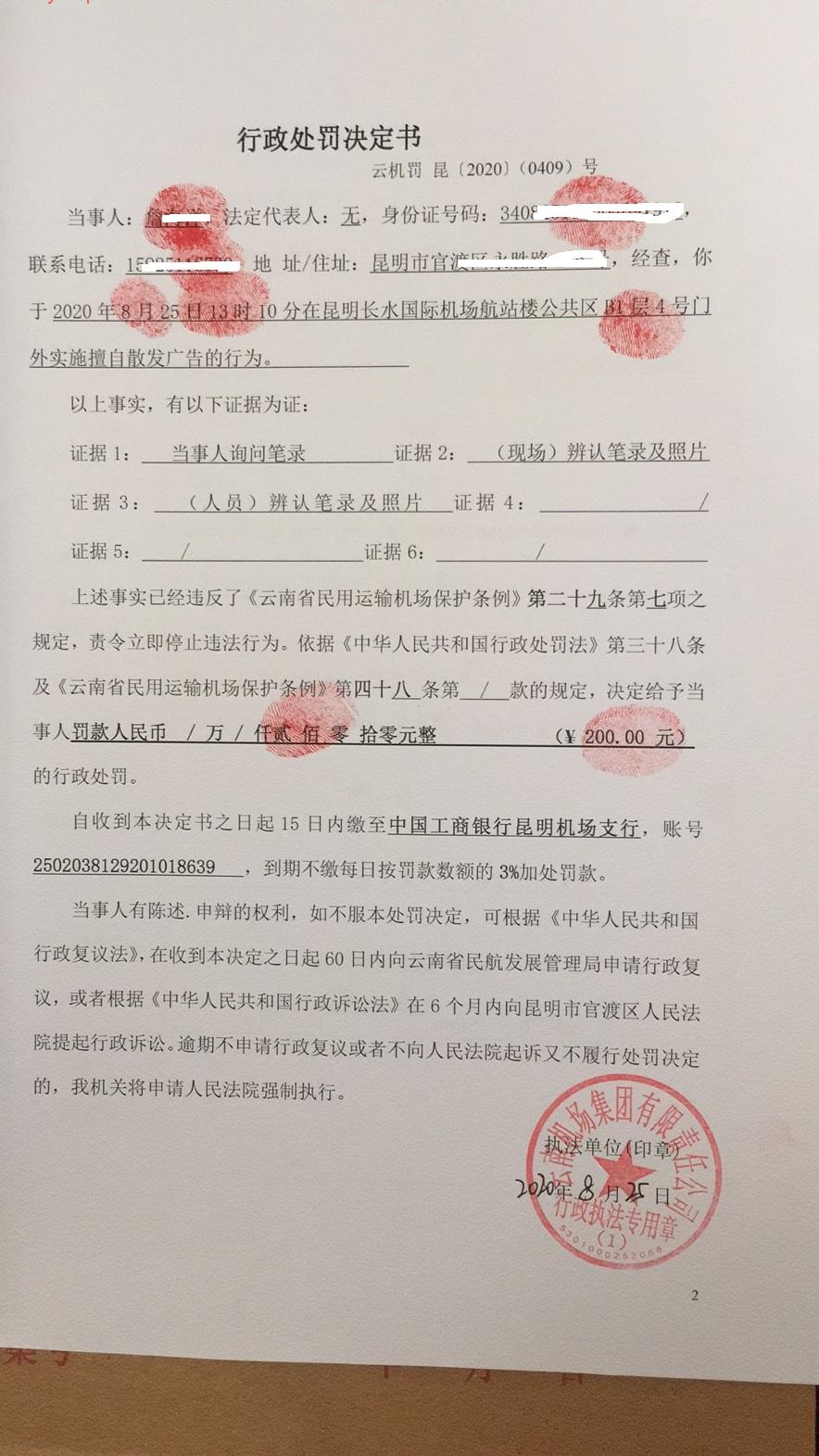 行政处罚决定书 云机罚 昆{2020} (0410)号