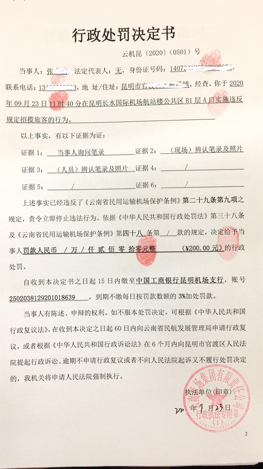 行政处罚决定书 云机罚 昆{2020} (0501)号