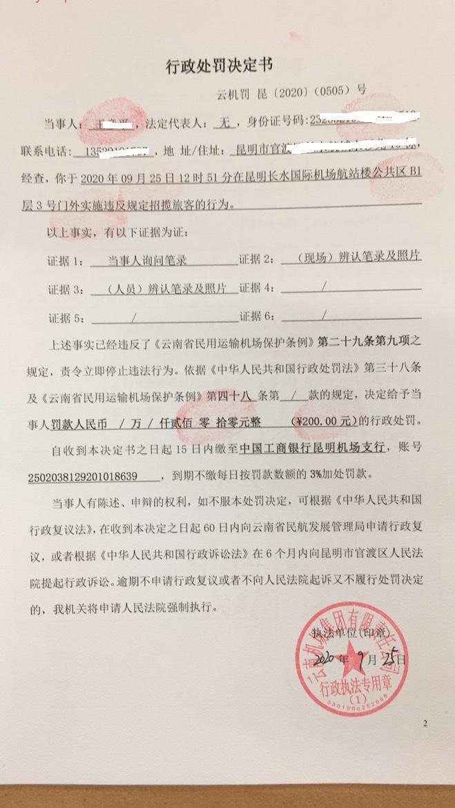 行政处罚决定书 云机罚 昆{2020} (0506)号