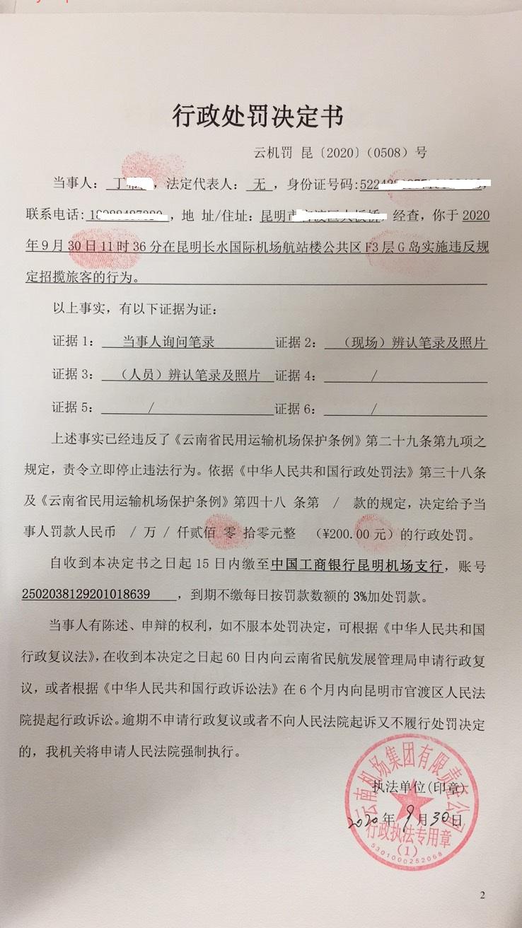 行政处罚决定书 云机罚 昆{2020} (0508)号