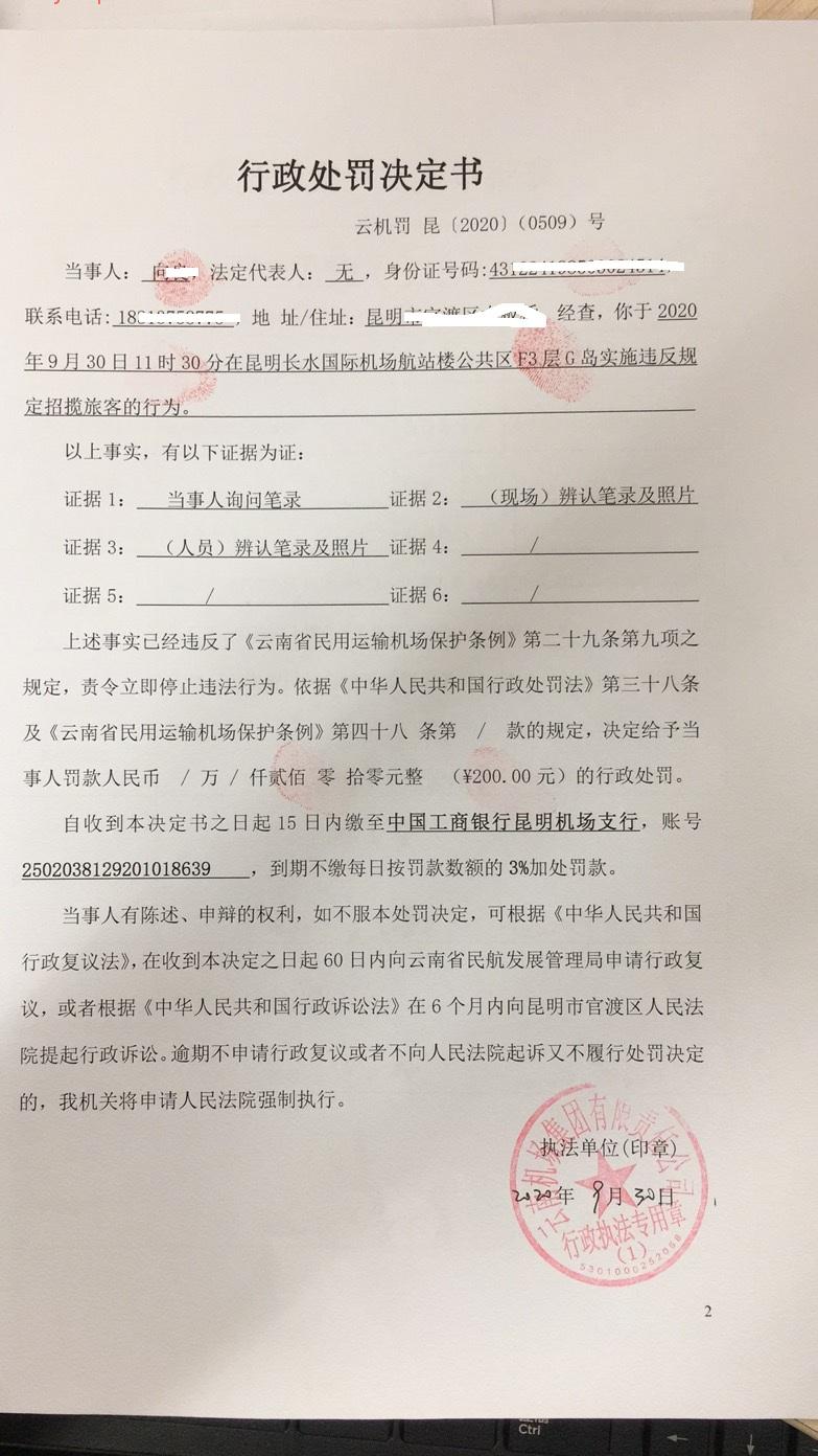 行政处罚决定书 云机罚 昆{2020} (0508)号