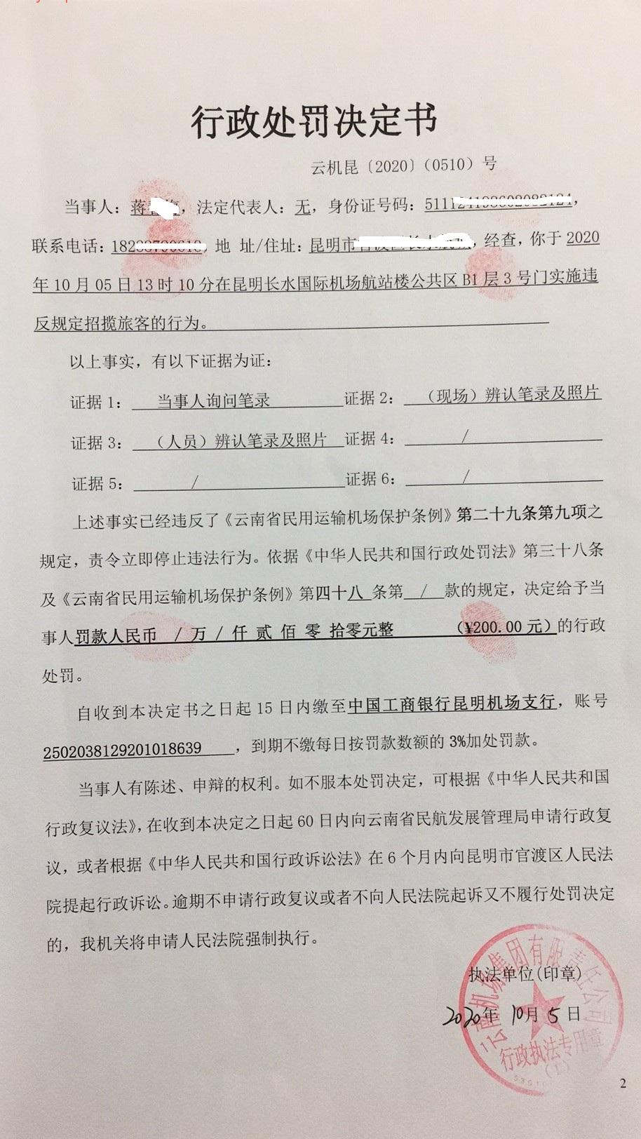 行政处罚决定书 云机罚 昆{2020} (0510)号
