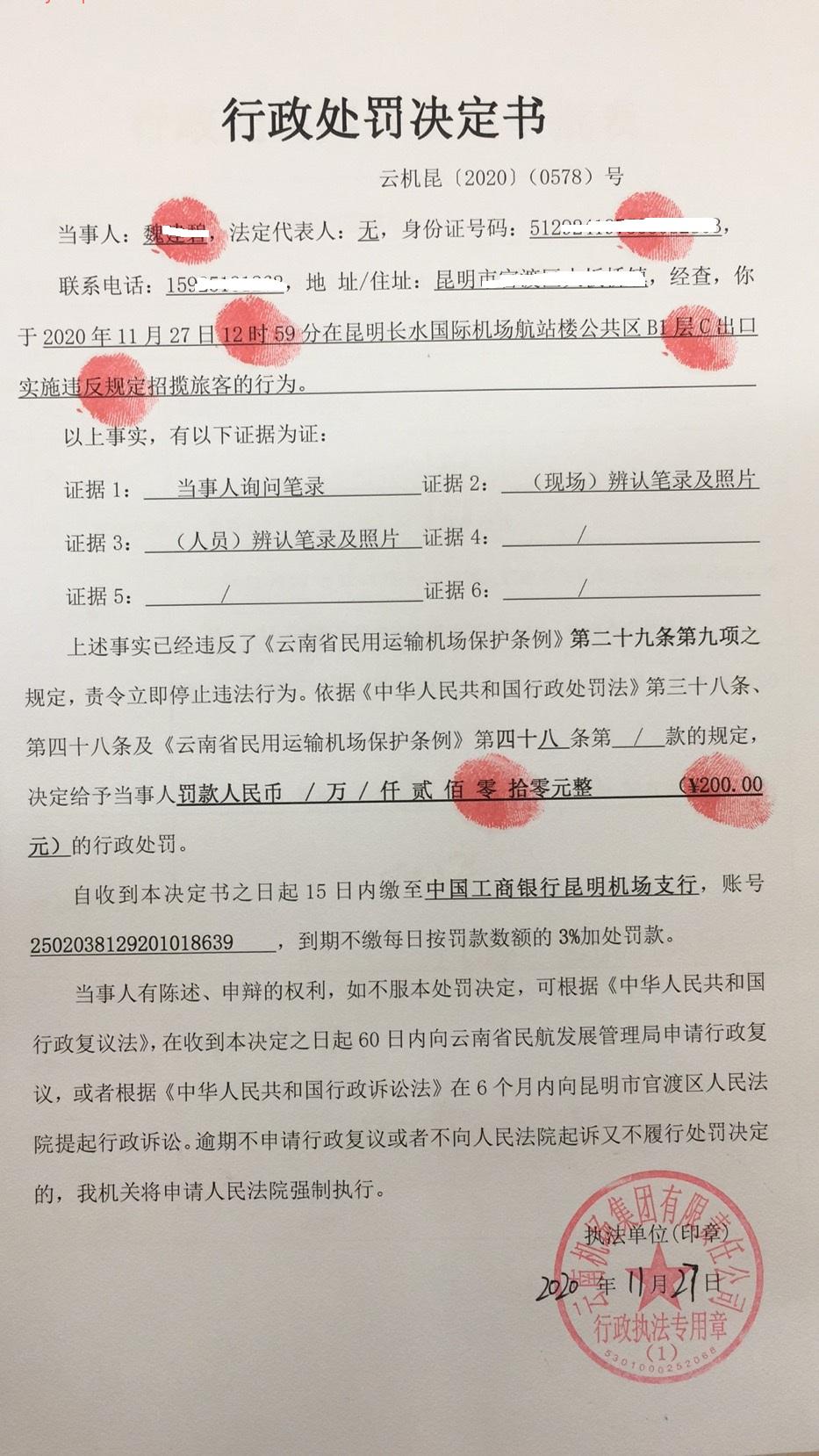 行政处罚决定书 云机罚 昆{2020} (0578)号