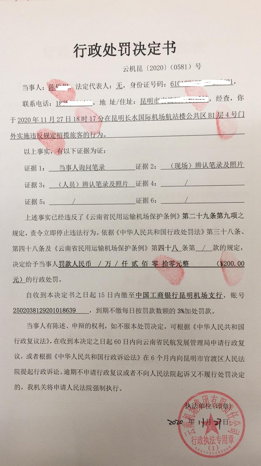 行政处罚决定书 云机罚 昆{2020} (0581)号