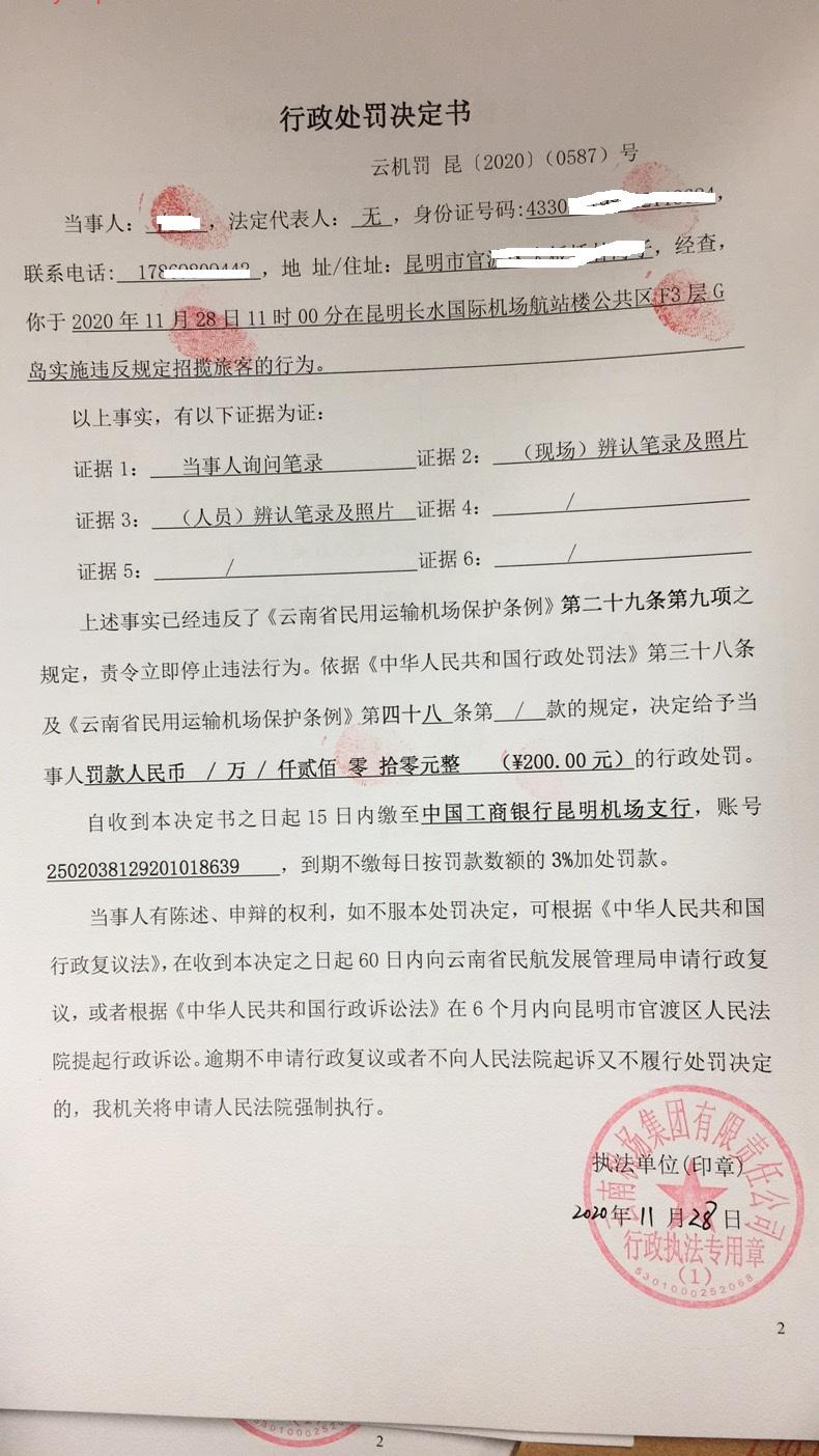 行政处罚决定书 云机罚 昆{2020} (0586)号