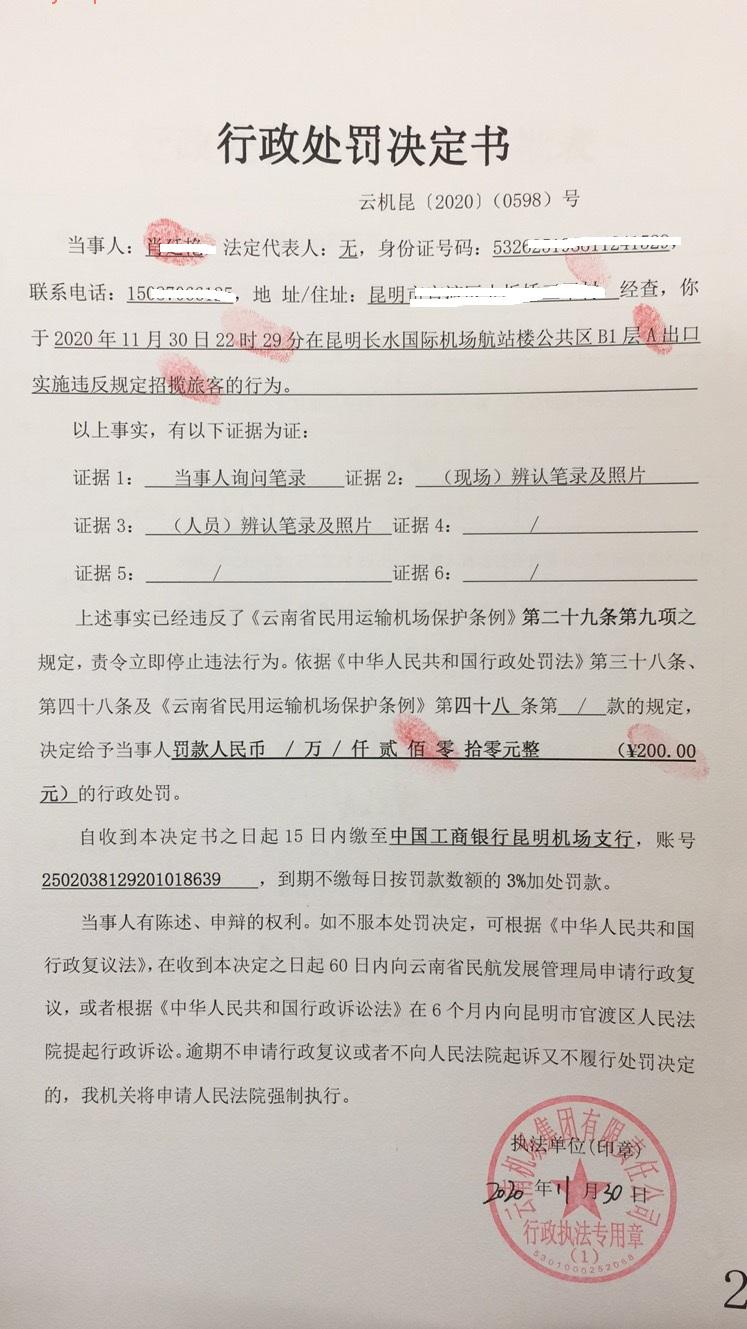 行政处罚决定书 云机罚 昆{2020} (0598)号