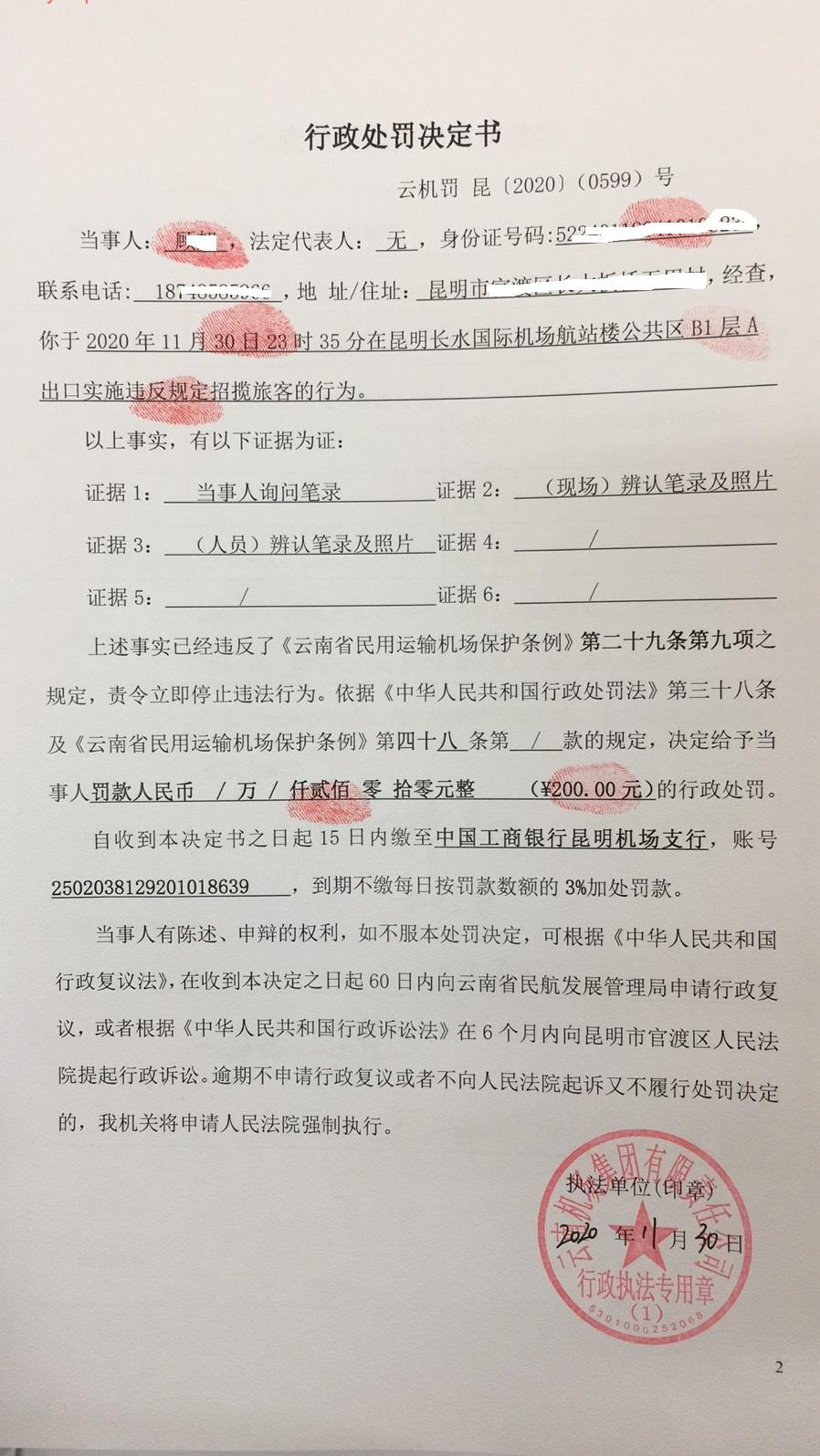 行政处罚决定书 云机罚 昆{2020} (0598)号
