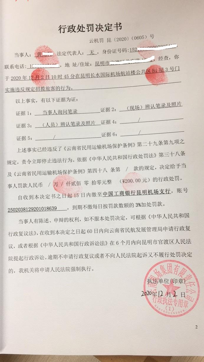 行政处罚决定书 云机罚 昆{2020} (0606)号