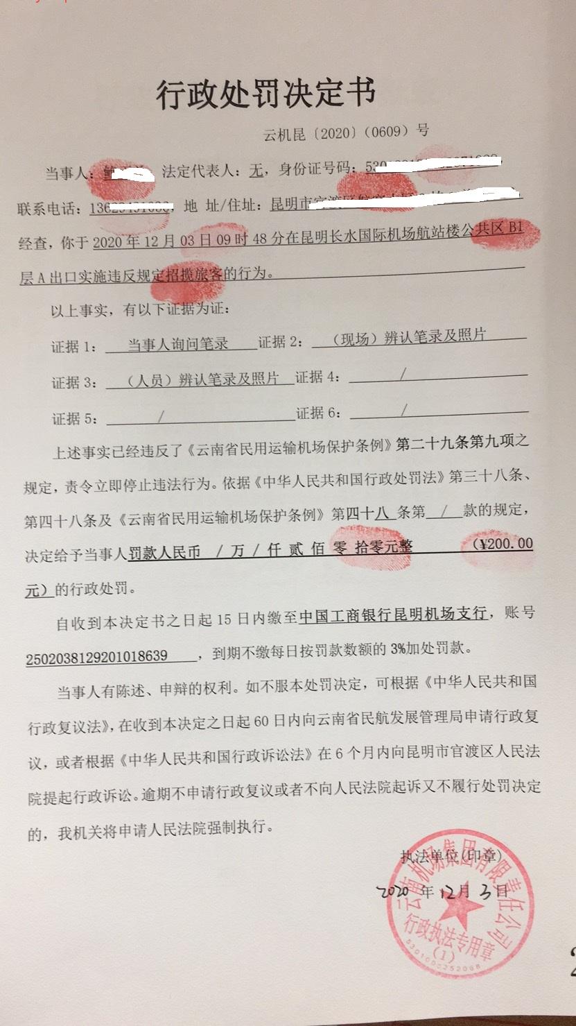 行政处罚决定书 云机罚 昆{2020} (0608)号