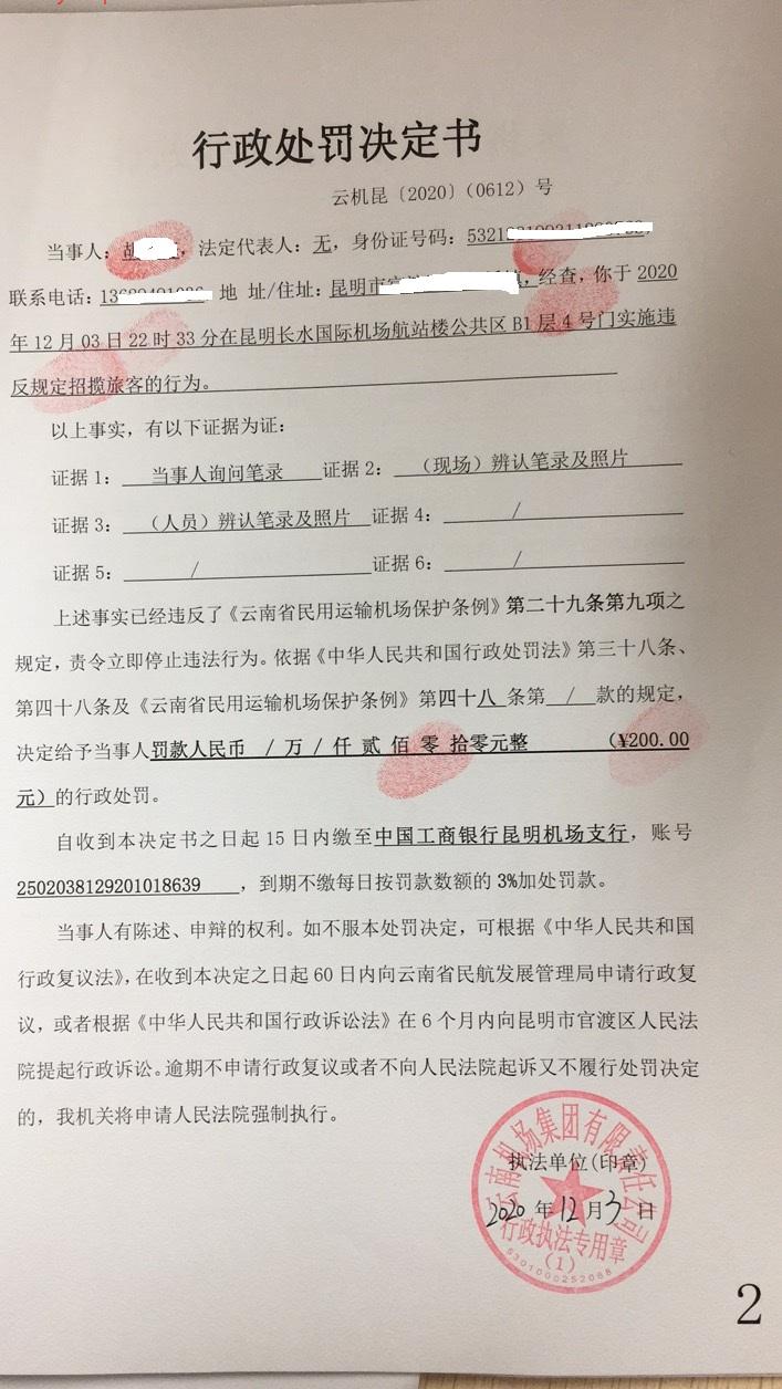 行政处罚决定书 云机罚 昆{2020} (0612)号