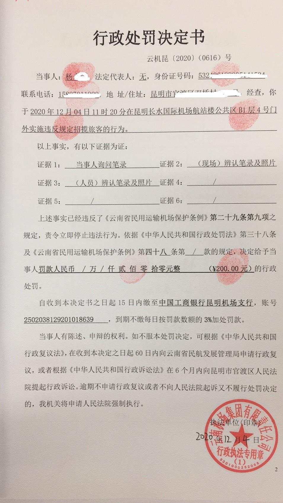 行政处罚决定书 云机罚 昆{2020} (0616)号