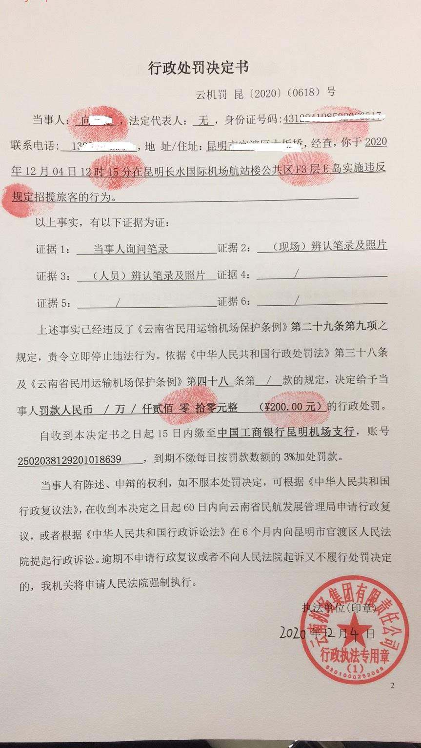 行政处罚决定书 云机罚 昆{2020} (0618)号