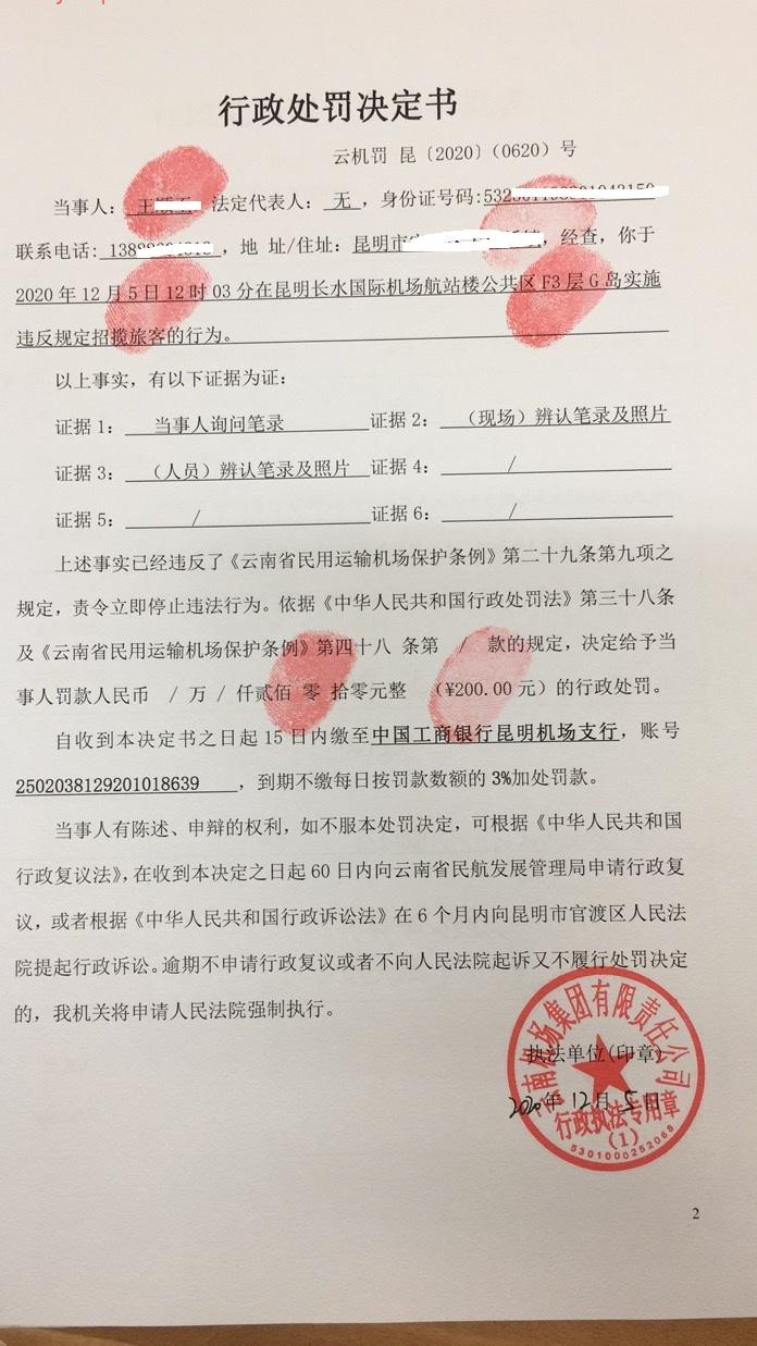行政处罚决定书 云机罚 昆{2020} (0621)号