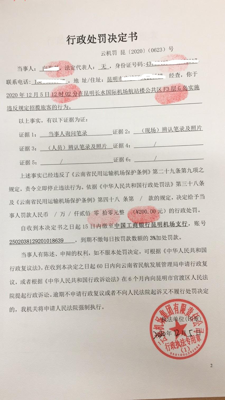 行政处罚决定书 云机罚 昆{2020} (0624)号