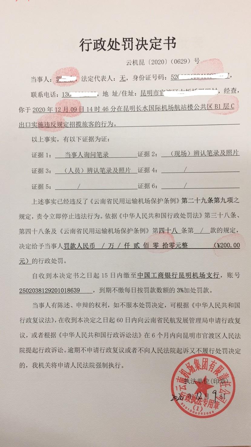 行政处罚决定书 云机罚 昆{2020} (0629)号