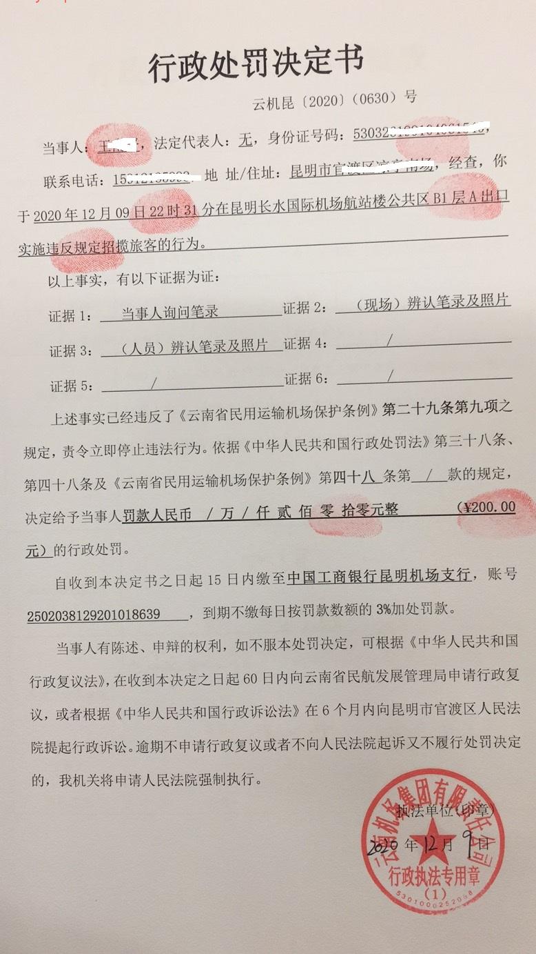行政处罚决定书 云机罚 昆{2020} (0630)号
