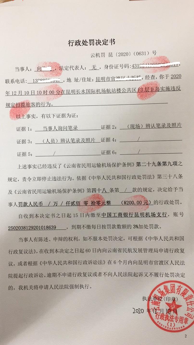 行政处罚决定书 云机罚 昆{2020} (0631)号