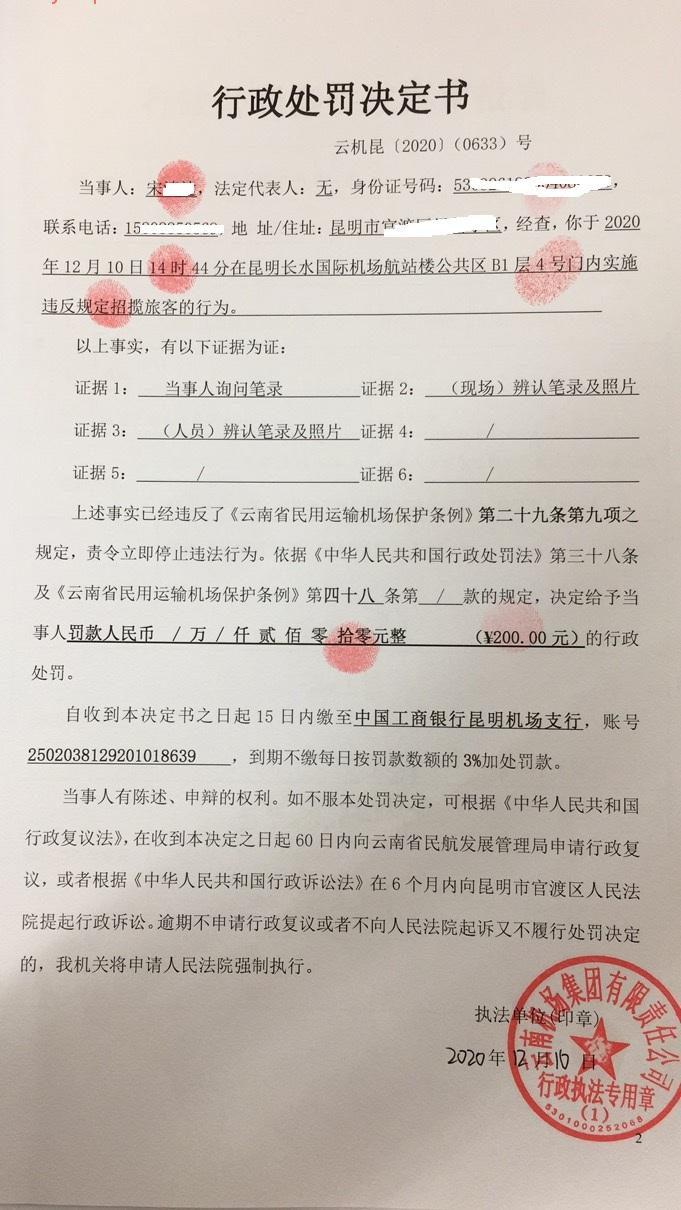 行政处罚决定书 云机罚 昆{2020} (0633)号
