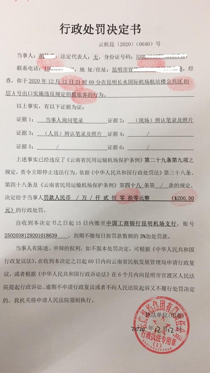 行政处罚决定书 云机罚 昆{2020} (0640)号