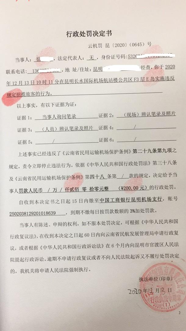 行政处罚决定书 云机罚 昆{2020} (0645)号