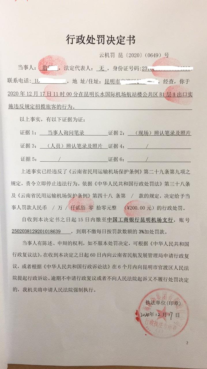 行政处罚决定书 云机罚 昆{2020} (0648)号