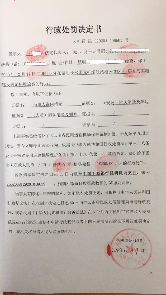 行政处罚决定书 云机罚 昆{2020} (0650)号