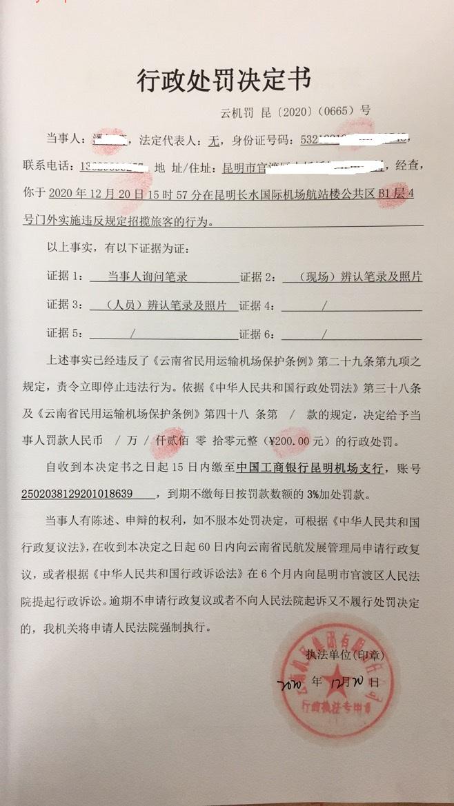 行政处罚决定书 云机罚 昆{2020} (0665)号