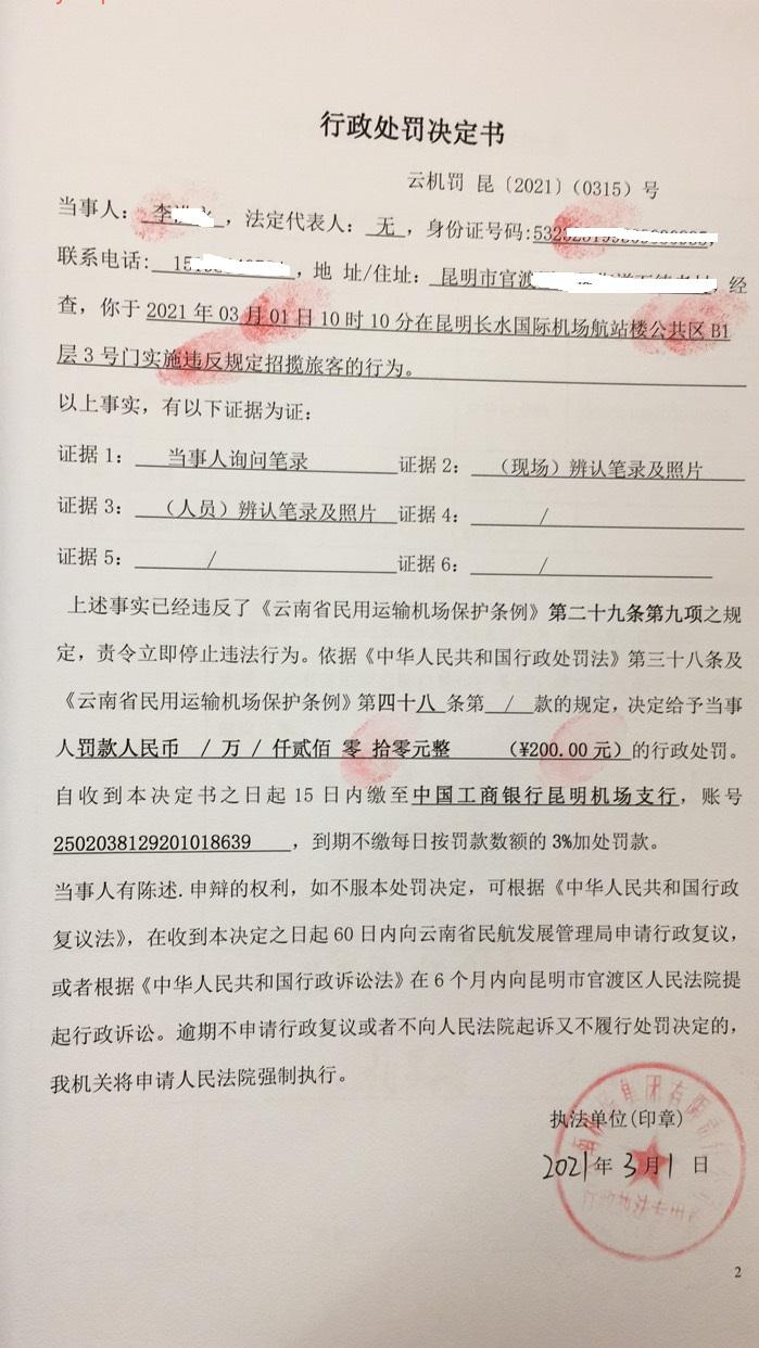 行政处罚决定书 云机罚 昆{2021} (0316)号