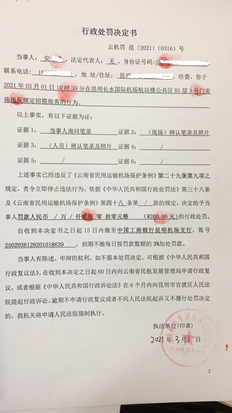 行政处罚决定书 云机罚 昆{2021} (0316)号
