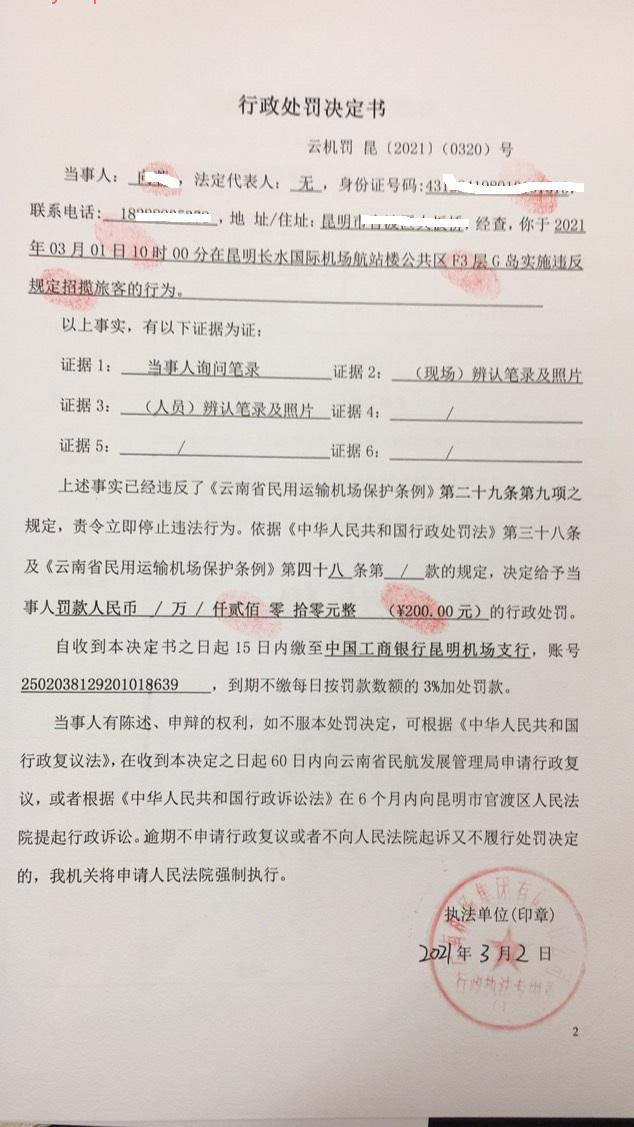 行政处罚决定书 云机罚 昆{2021} (0320)号