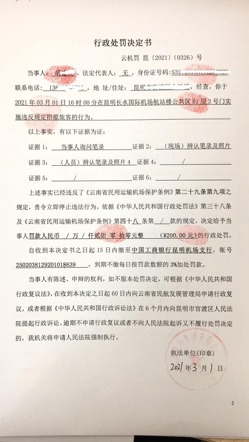 行政处罚决定书 云机罚 昆{2021} (0326)号