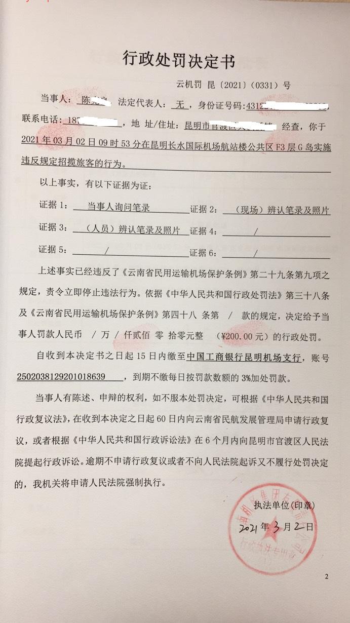 行政处罚决定书 云机罚 昆{2021} (0331)号