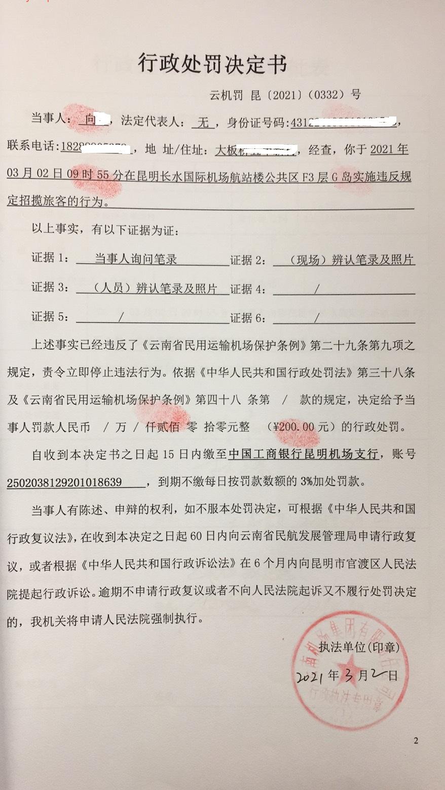 行政处罚决定书 云机罚 昆{2021} (0332)号